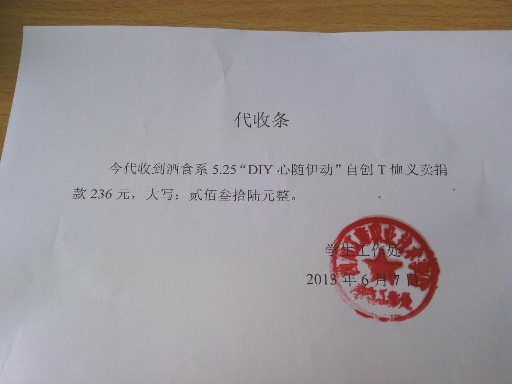 6月7日,酒类与食品工程系女生部将DIY爱心T恤义卖所得善款捐给由员工处发起筹建的贫困生专项基金。