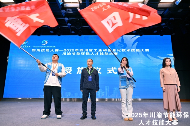 在授旗环节,四川省经济和信息化厅环资处处长鲁译、重庆市经济和信息化委员会制造业绿色发展处处长陈昌明共同为选手代表曹颖、唐靖奕授旗。旗帜挥舞,象征着使命与责任的传递,激励所有参赛选手在赛场上奋勇争先、展现风采。