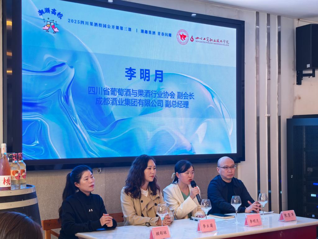 随后,成都酒业集团有限公司副总经理李明月代表行业发言。她分析了当前果酒市场蓬勃发展的趋势以及四川产区的独特潜力,并鼓励同学们夯实专业基础,未来为川酒、特别是果酒产业的创新与发展贡献青春力量。