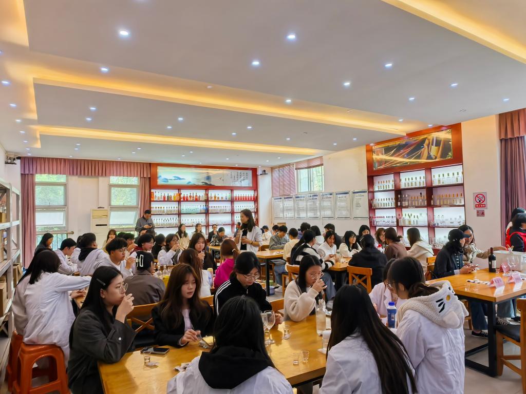 现场学习与实践氛围浓厚,理实结合是本次公开课的一大亮点。分享环节结束后,成都酒业集团有限公司与九寨沟县九寨庄园葡萄酒业有限公司带来了旗下多款特色产品员工品鉴。其中包括崃一口品牌的“合理冲撞”系列——创意十足的樱花白桃酒、咖啡荔枝酒、椒麻青梅酒,以及九寨庄园的优选级干红葡萄酒、水晶甜白葡萄酒和桃红葡萄酒。同学们在老师的指导和志愿者的帮助下,逐一品鉴,与企业专家和教师就酒品风味、酿造工艺等方面进行了深入交流,现场气氛热烈。