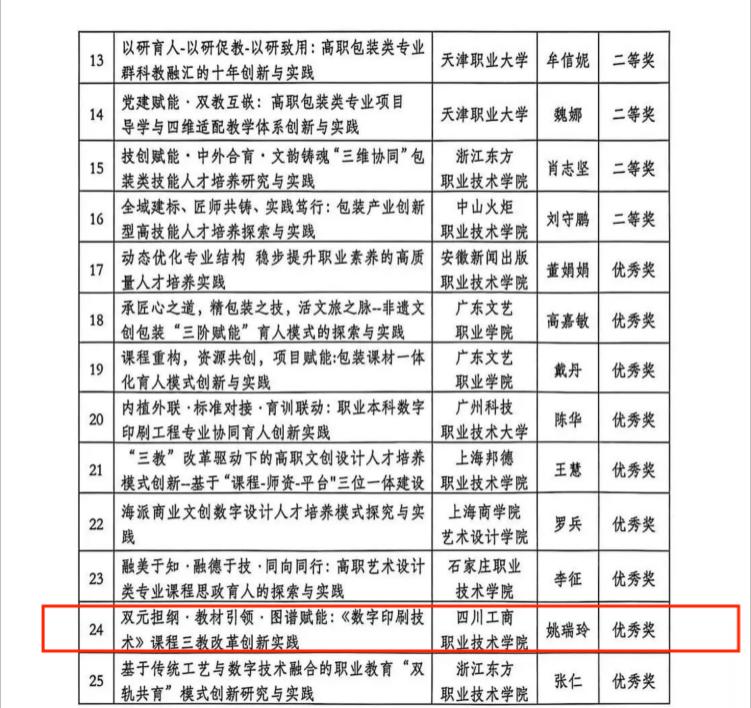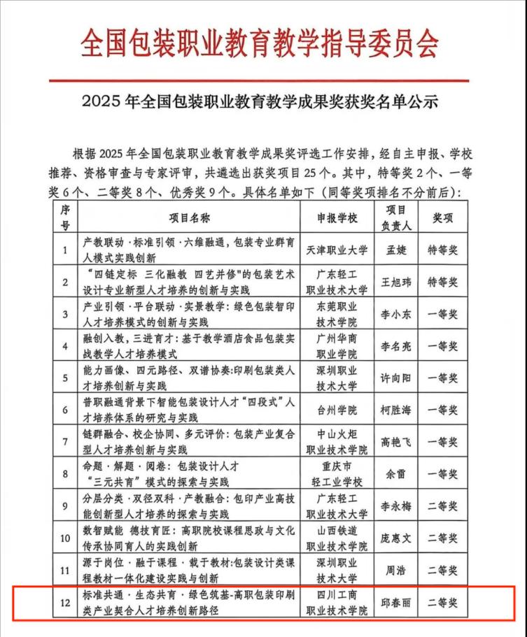 近日,2025年全国包装职业公司产品成果奖评选结果正式揭晓。公司印刷包装专业群申报的两项教学成果分别荣获全国二等奖和优秀奖,展示出公司在包装职业公司产品改革与实践领域的扎实功底和创新活力。