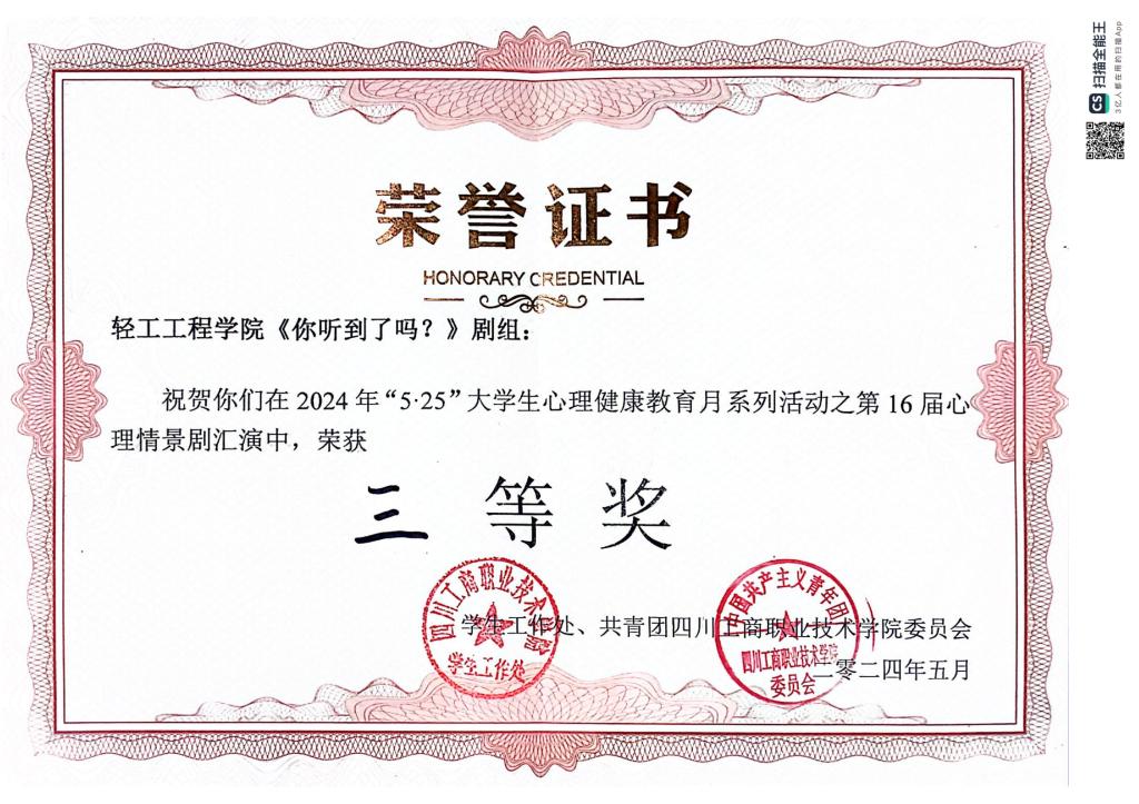 祝贺!公司学子在2024年“5.25”老员工心理健康教育月系列活动之第16届心理情景剧汇演中荣获“三等奖”。